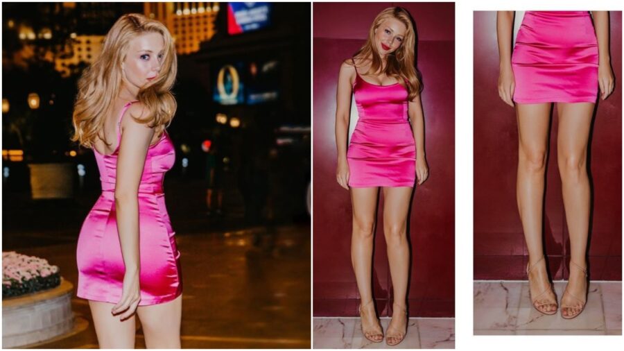 Тіна Кароль дуже любить рожевий колір в одязі, адже він їй дуже пасує. Та найбільш ефектною є облягаюча міні-сукня, в якій співачка позувала на одній із фотосесій.