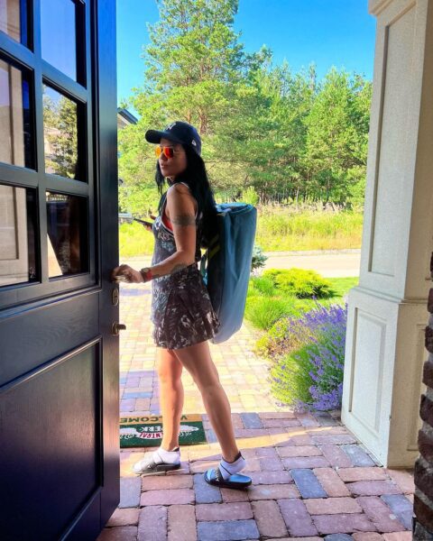 На знімку вона позує у літньому сарафані, капцях та кепці, тримаючи спортивну сумку. В такому вигляді Ірину підловили діти, коли вона виходила на подвір’я їх триповерхового особняка під Києвом. Цегляні стіни у стилі лофт стильно поєднуються з білими колонами та висадженими кущами лаванди біля дому.