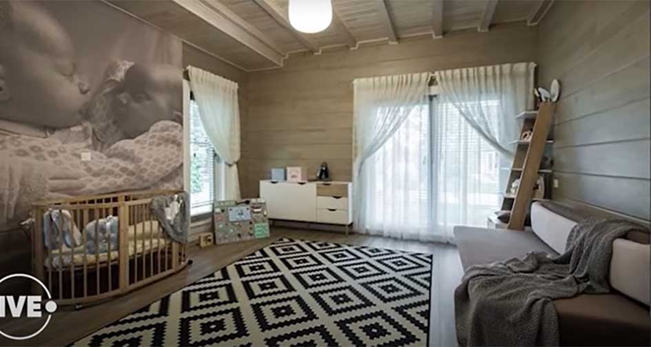 В середині все теж виконано з дерева. У вітальні доволі висока стеля, яку прикрашає чимала люстра. Дизайн розроблено так, що в маєтку чудово уживаються антикварні речі з автентичними, які господиня частенько привозить із подорожей.