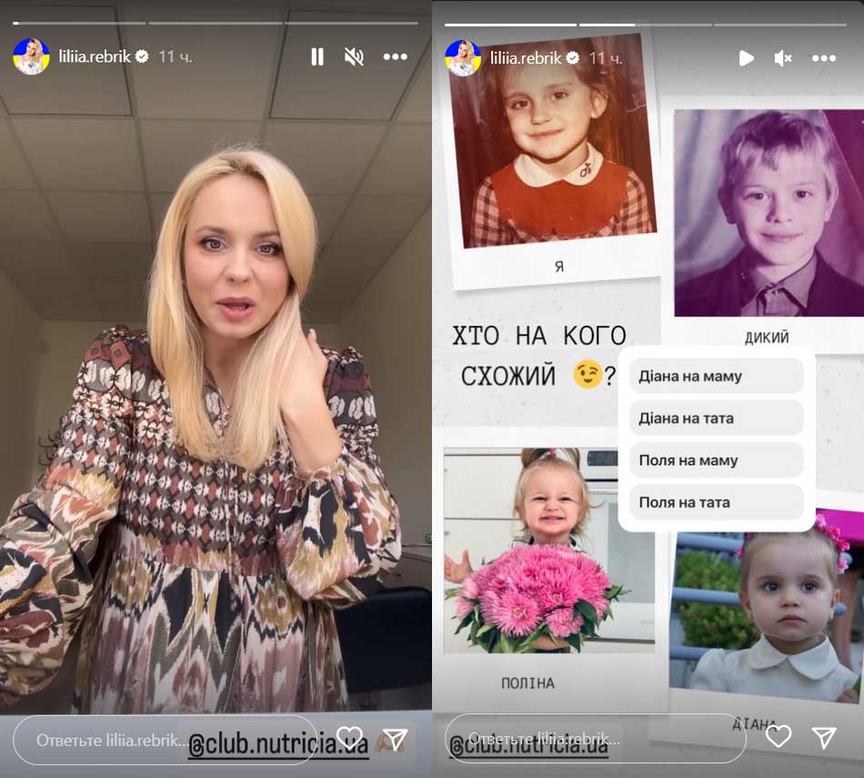 У своєму акаунті Інстаграм вагітна третьою дитинкою Лілія Ребрик вирішила з’ясувати, на кого схожі дві її старші доньки – на маму чи на татуся. Задля цього знаменитість виклала в мережу світлини, де зображені вона і її чоловік Андрій Дикий у дитинстві.