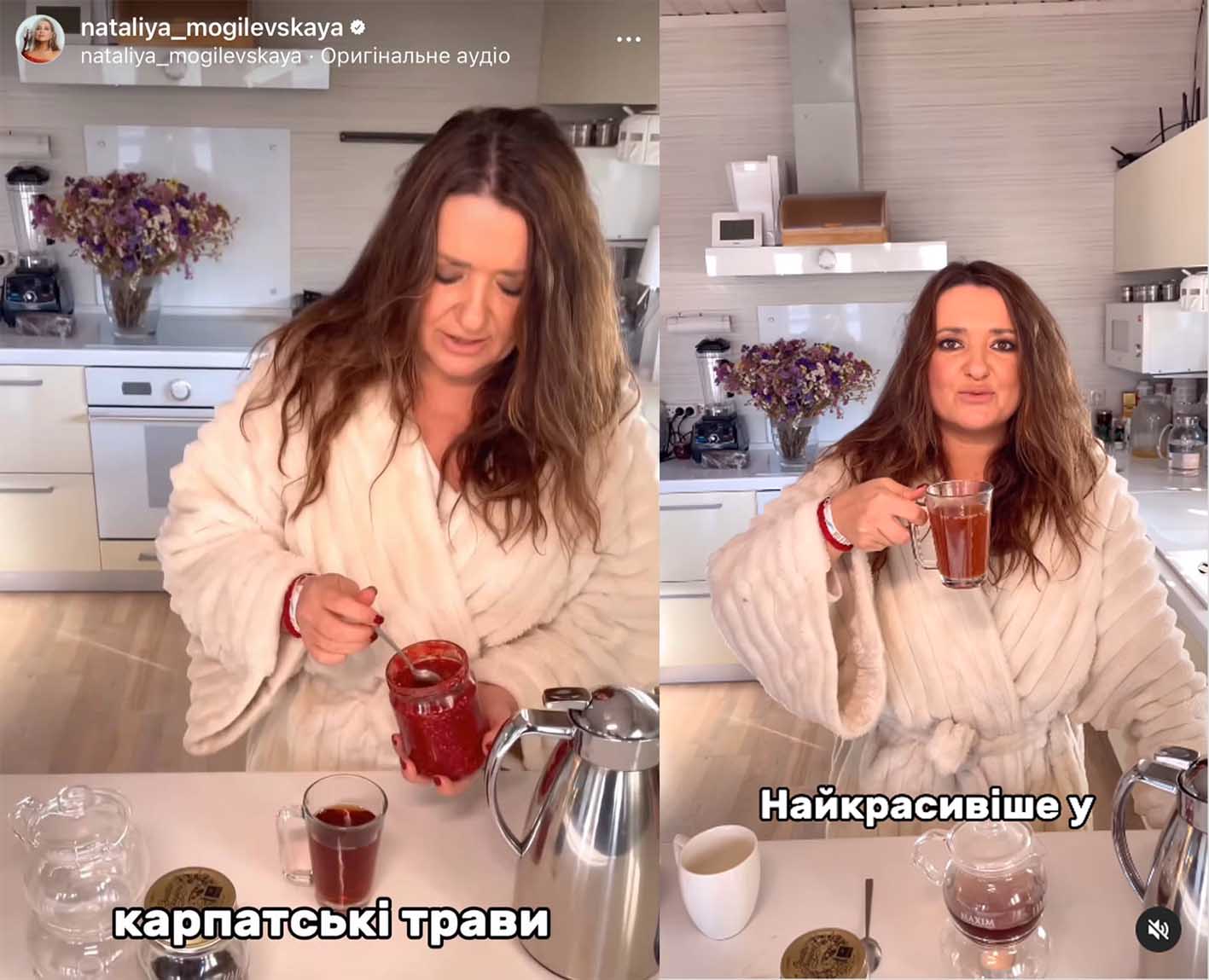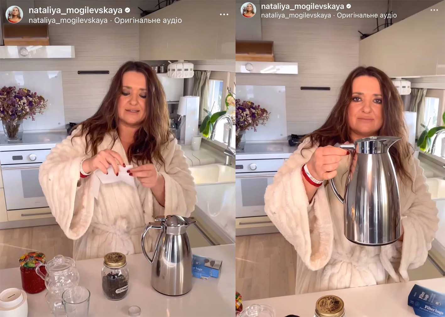 Допоки Наталка розповідала рецепт приготування чаю, вбрана в махровий халат із широкими рукавами, підписники мали можливість роздивитися кухню знаменитості. Все дуже ошатно й виконано у світлобежевих тонах, як і вбрання Могилевської.