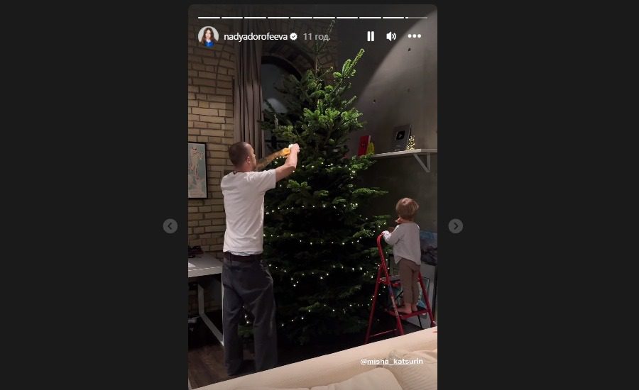 Надія Дорофєєва вирішила поділитися з прихильниками сімейним моментом – прикрашанням новорічної ялинки разом зі своїм чоловіком Мішею Кацуріним та його сином. Відео було опубліковане на сторінці Надії в Instagram.