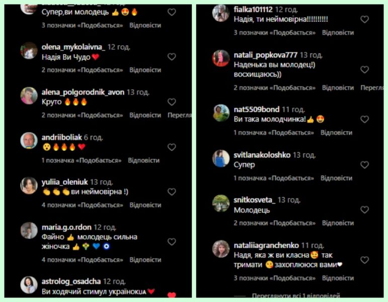 - “Надя, яка ж ви класна. Так тримати. Захоплююся вами”.