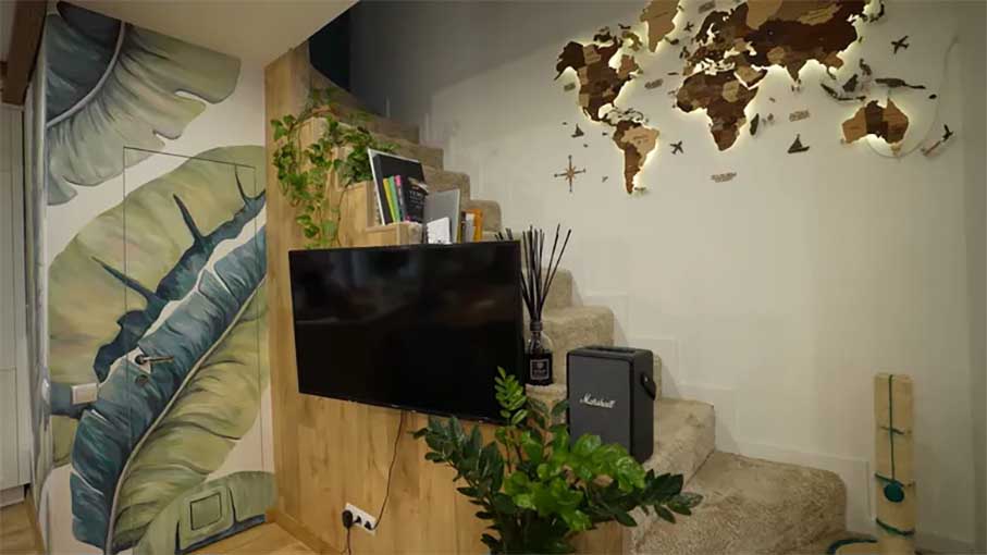 Поміж намальованої рослинності є чимало живих квітів. У цьому куточку раю пара частенько пригадує свої танцювальні навички, влаштовуючи батли просто посеред кімнати.