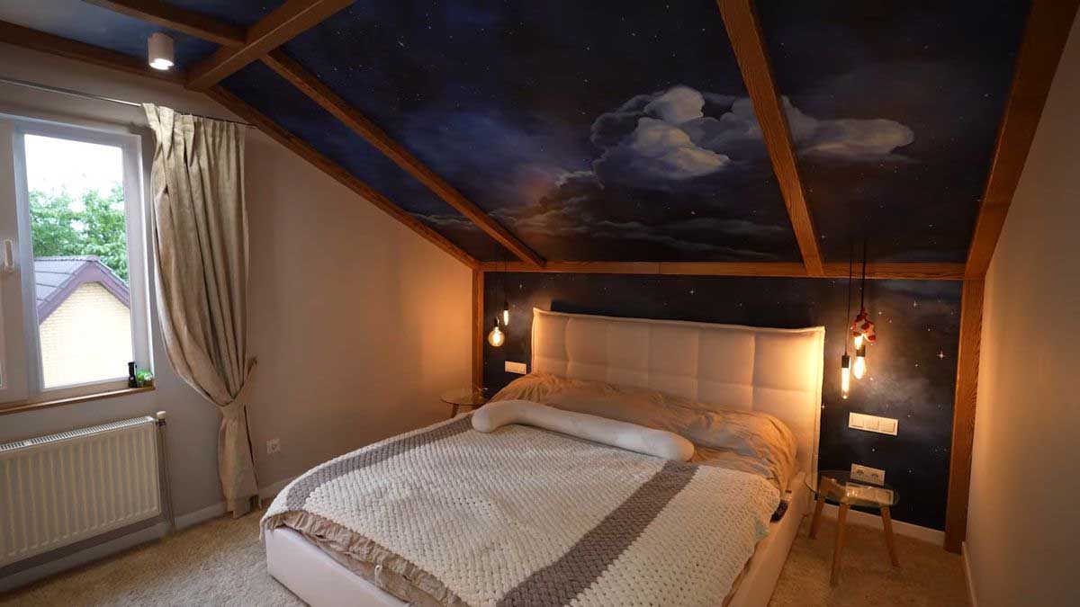 За парканом невеликий дворик із мангалом. Двоповерхова споруда доволі простора. Стіни в середині будинку розмальовані чудернацькими малюнками. У спальні зображено ліс, а на стелі – зорі з хмарками перед світанком.