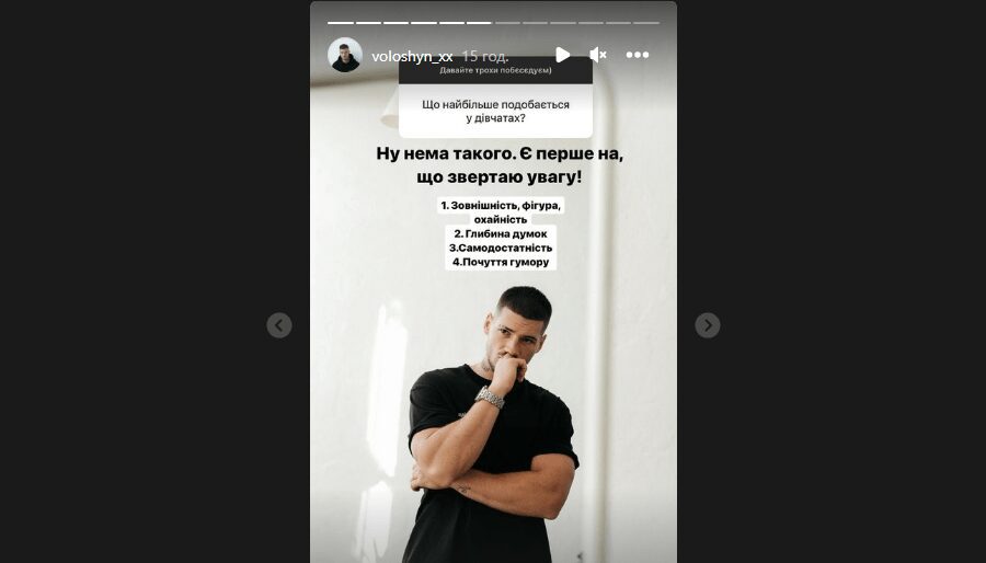 Пізніше підписники дізналися про те, що саме Олександр цінує в жінках. Він перелічив кілька критеріїв, на які звертає увагу, серед яких зовнішність, фігура, охайність, глибина думок, самодостатність і почуття гумору.