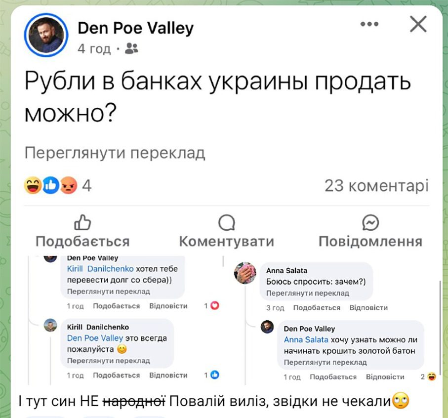 Нещодавно Денис цікавився в мережі, чи можна в Україні продати рублі. Певно, матуся не забуває про нащадка і підсипає безробітному синочку грошенят. Скріншот опублікувала у своєму Телеграмі Аліна Доротюк. До речі, подейкують, що й сама Таїсія не гребує діставати з шухляди український паспорт, коли потрібно відвідати власний будиночок на курорті в Іспанії.