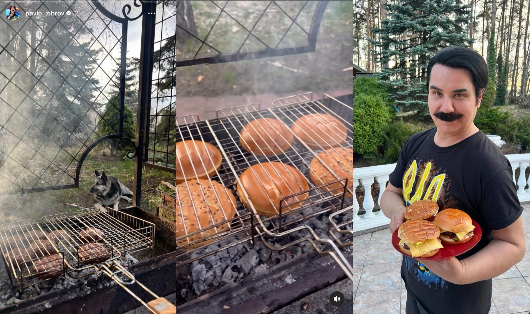 Отак у турботах й не помітив, як завечоріло. Час перекусити. Пан Павло вирішив приготувати бургери з м’ясцем, овочами та сиром. Задля цього довелося запалити мангал. Артист зізнався підписникам: