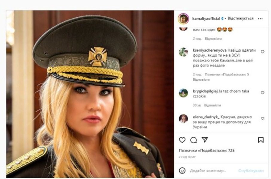 Камалія й справді зустрічалася з колишнім очільником ЗСУ і має спільні фото. Але коли вбралася у його форму, поряд із хвалебними коментарями отримала й негатив. При всій повазі до зірки її попросили не вдягати військову форму, якщо не служить в армії.