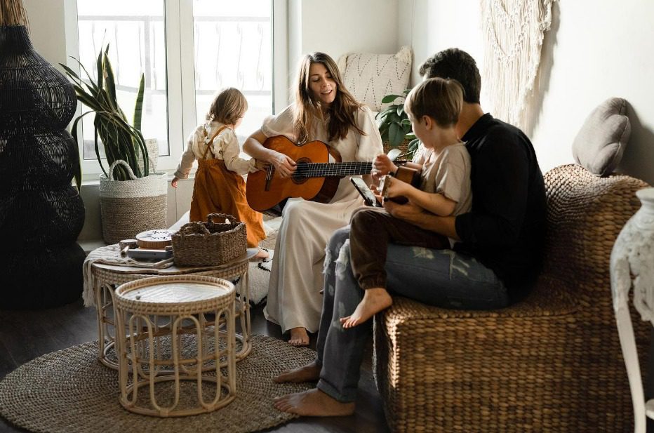 На іншій світлині бачимо голову родини вже з гітарою. Він музикує на лоджії. Місця тут доволі не багато, тому з меблів лише невелика дерев’яна тумбочка. А ще коричневе панно на стіні з горщиками для квітів.