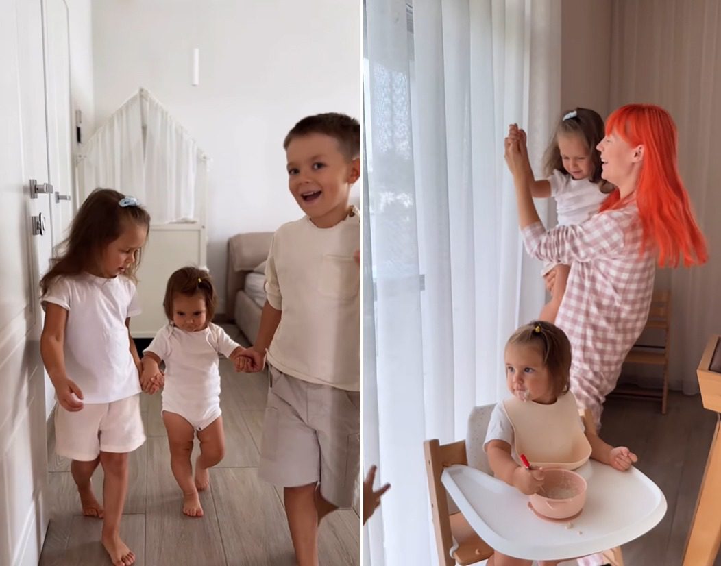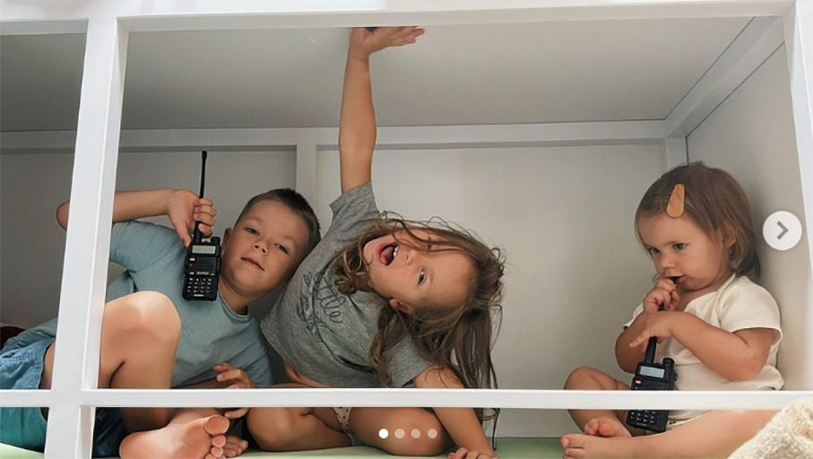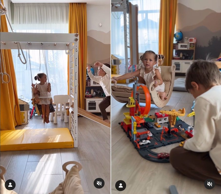Дитяча кімната облаштована з урахуванням потреб усіх трьох дітлахів. Допоки Марійка катається на гойдалці, вмонтованій у шведську стінку, старший братик займається збором конструктора на підлозі. А для найменшої Поліни є ще й дитячий коник-гойдалка.