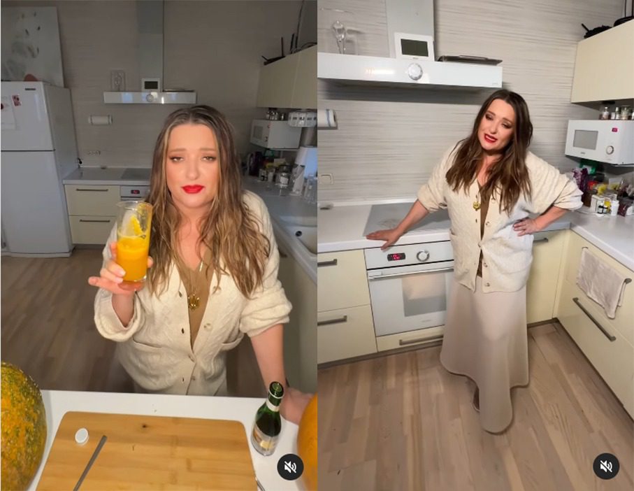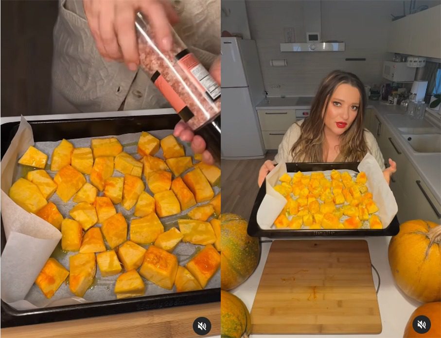 Далі зірка показала, як вправно може обчистити гарбуз, порізати на шматочки й викласти на пергамент, яким вистелено деко для запікання. Далі наша господиня збризнула овоч оливковою олією, підсолила гімалайською рожевою сіллю, наголосивши, що біла рафінована неабияк шкідлива для здоров’я.