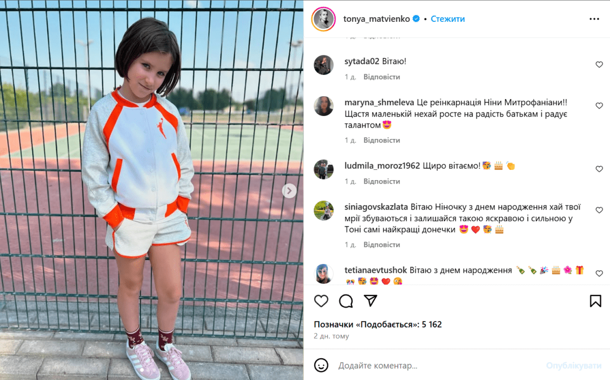 Нещодавно Матвієнко-молодша поділилася зворушливими фото до дня народження доньки Ніни, якій виповнилося дев’ять років. Співачка розповіла, як сильно любить свою наступницю та наскільки важливу роль малеча відіграє в її житті. Тоня згадала, що донечка стала для неї справжнім джерелом сили й натхнення, адже підтримувала у найважчі моменти. Вона також зазначила, що разом із чоловіком Арсеном Мірзояном вони роблять усе, щоб маленька була щасливою, здоровою та усміхненою.