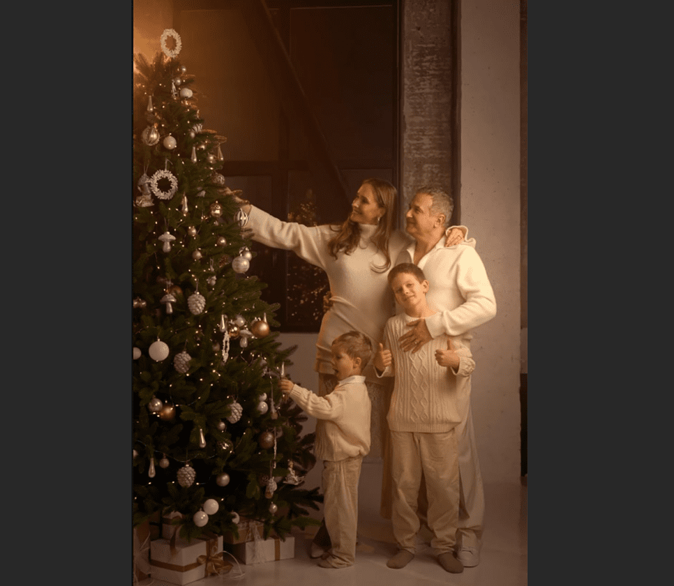 Старший син Катерини Осадчої нині навчається в Америці, тож Новий рік родина зустрічає не в повному складі – з татом двох молодших синів ведучої Юрієм Горбуновим. Окрім звичних кульок серед ялинкових прикрас можна помітити грибочки, шишки та різдвяні віночки.