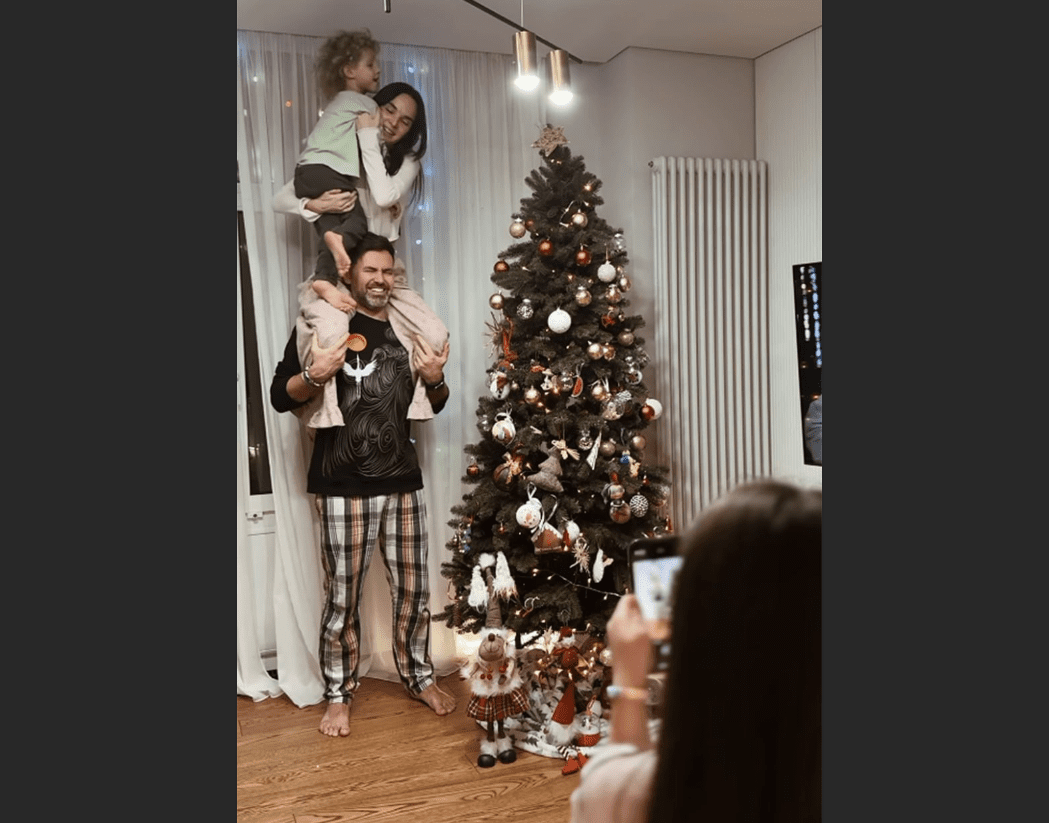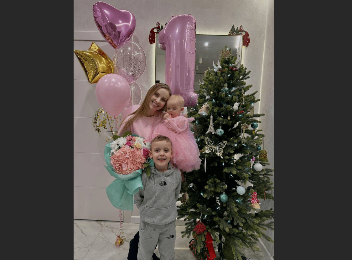 Щаслива мама двох діточок показалася біля ялинки зі старшим сином Тимуром та маленькою Мірою, якій у грудні минув лише рік. Окрім кульок на гості з лісу можна побачити ще й Ейфелеву вежу, золотий ключик та величезного метелика.