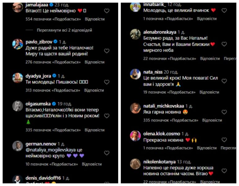 Під публікацією першими її привітали знаменитості, такі як Павло Зібров, Ольга Сумська, Джамала та інші. Також можна прочитати безліч відгуків, які висловлюють подяку та велику повагу до Могилевської. Ось, які коментарі можна зустріти: