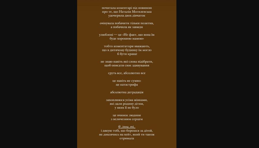 Закінчуючи свій допис, вона також висловила подяку Інні Мірошниченко та її чоловіку, які також прийняли дитину.