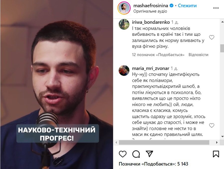 Не всі підписники ведучої були у захваті від обраної теми. Серед публіки виявилося чимало пуристів. Зокрема, під постом Маші можна прочитати коментарі на зразок: “Вся ця палітра не є розвитком — це хвороба. Зараз людям потрібно думати про зовсім інші речі. Будь ласка, припиніть учити людей диявольським речам”, або “Спочатку вони ідентифікують себе як поліамори, пропонують відкриті стосунки, а потім лікуються в психолога, бо, виявляється, що “ніхто нікого не любить”.