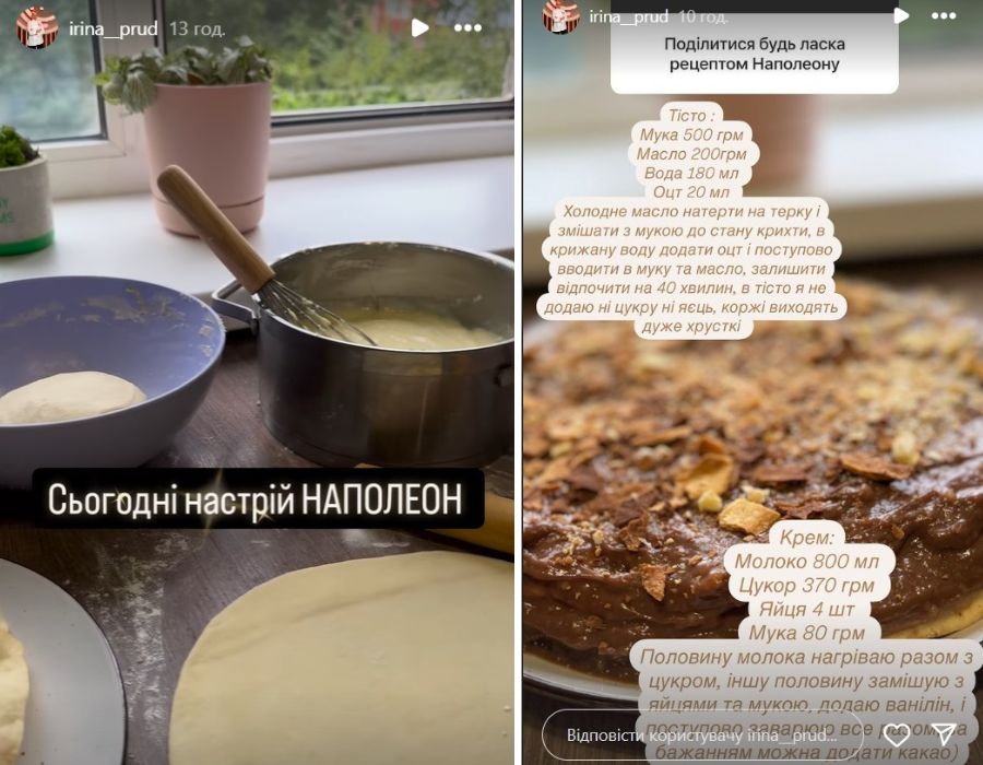 Жінка не полишає улюблене заняття ні на день. Вона регулярно готує та ділиться новими рецептами зі своїми підписниками в Instagram. Наприклад, днями Пруднікова показала своїм підписникам, як готувати шоколадний торт “Наполеон”.