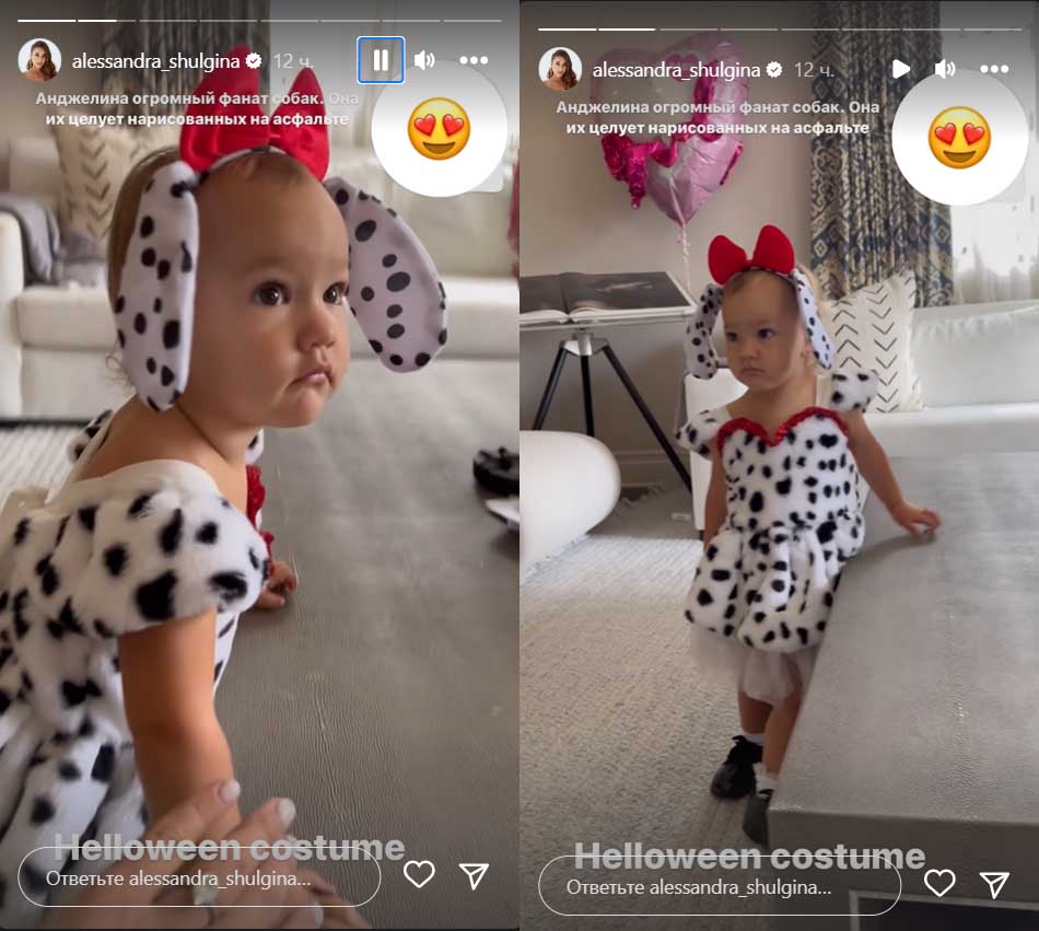 Натомість перемикається на Анджеліну, якій минув рік і 4 місяці. У переддень Гелловіну 35-річна Олександра вирішила приміряти костюмчик для свята. Оскільки донечка обожнює собачок, то і лук їй підібрали відповідний.
