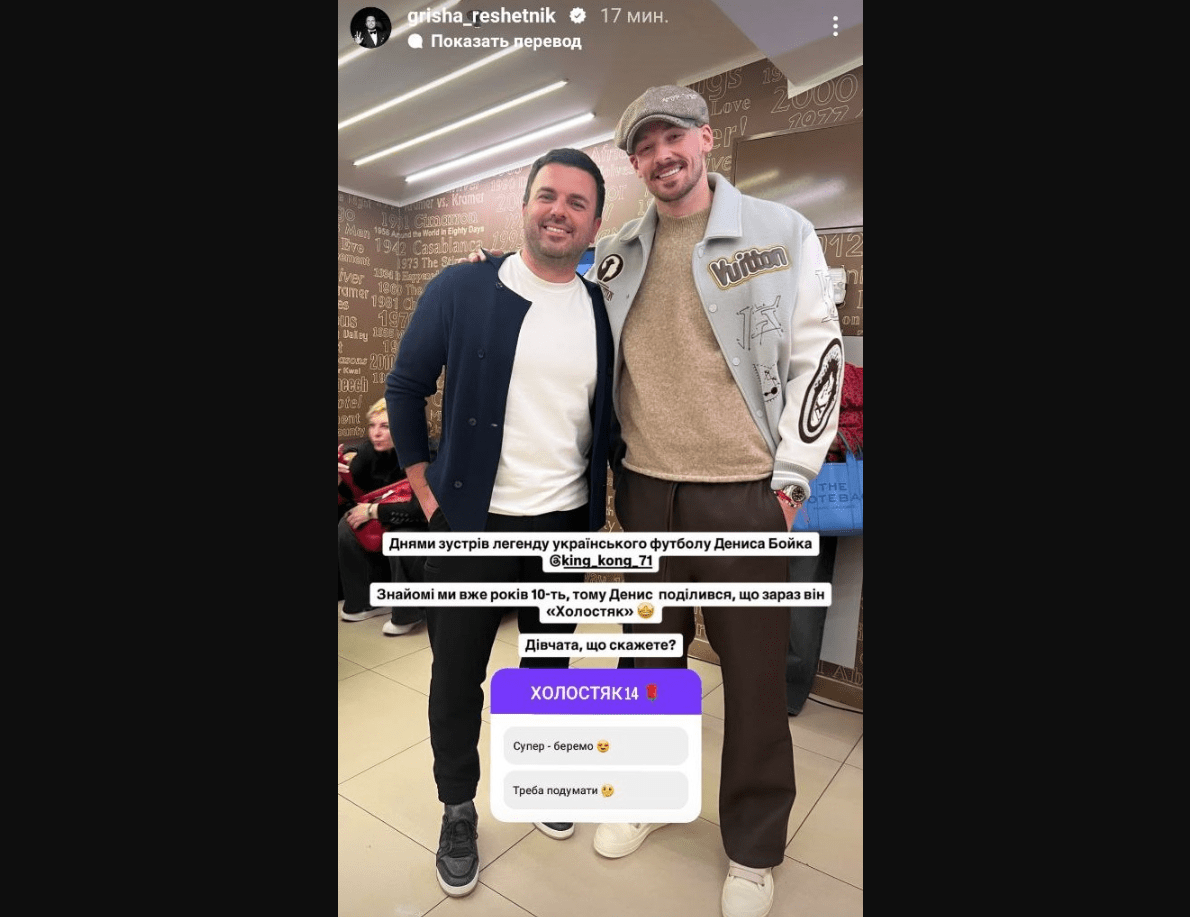 Невдовзі ведучий опублікував фото з відомим українським футболістом Денисом Бойком, колишнім воротарем “Динамо” і збірної України. Шоумен зізнався, що вони знайомі вже понад десять років, і розповів, що спортсмен поділився з ним, що наразі як раз неодружений.