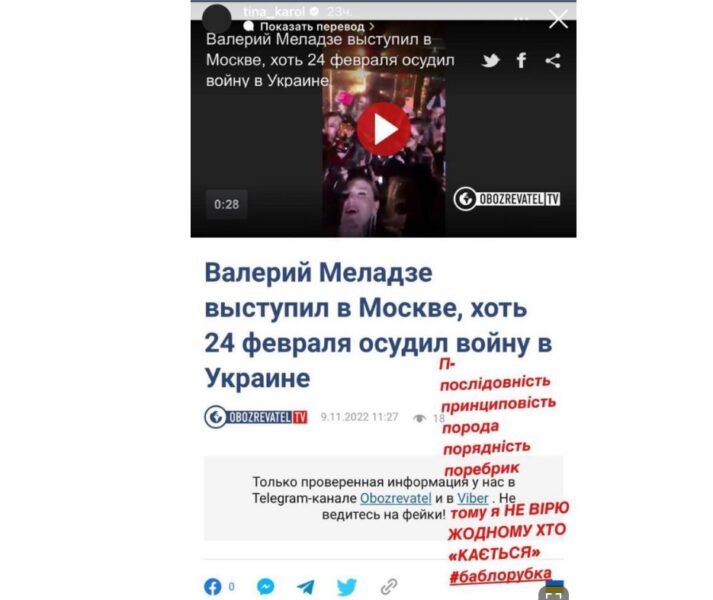 Співачка у своєму Інстаграм-блозі оприлюднила сторіз, в якому висловила свою думку про Меладзе. Тіна зазначила, що ще тоді не вірили всім росіянам, які “каялись” і зараз її здогадки підтвердились. Артистка переконана, що Меладзе закрив очі на свою совість та порядність заради грошей.