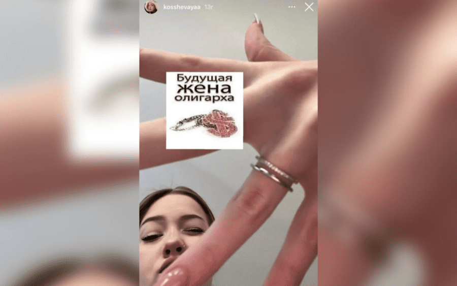 В Інстаграм-історіях в особистому блозі Варвари Кошової з’явилась цікава фотографія. Дівчина з зухвалим виразом обличчя показує крупним планом свою праву руку. Так, у кадр потрапив безіменний палець Варвари з обручкою на ньому. Зіркова донька додала до опублікованої фотографії картинку з пафосним підписом: “Майбутня дружина олігарха”.