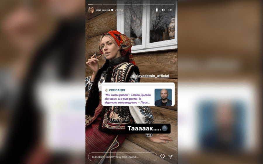 Спершу знаменитість звернула увагу на новину про свого колегу, телеведучого Славу Дьоміна. Так, у статті йшлось про те, як чоловік в особистому блозі зізнався в стосунках з відомою українською ведучою, а публіка намагалась з’ясувати, хто ж це може бути. Найбільше підозр впало саме на Нікітюк, адже вона є чи не єдиною загадковою холостячкою в українському шоубізнесі. Так, зірка не стала нічого коментувати – Нікітюк просто прикріпила скріншот новини та залишила позначку профілю Дьоміна.