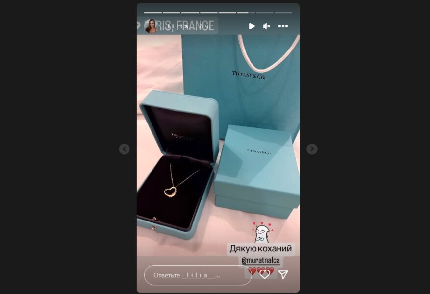 В своєму Інстаграм-блозі Лілія похизувалась сюрпризом, який отримала від турка в Парижі. Це ланцюжок з підвіскою сердечком з рожевого золота 18 карат від Tiffany&Co.