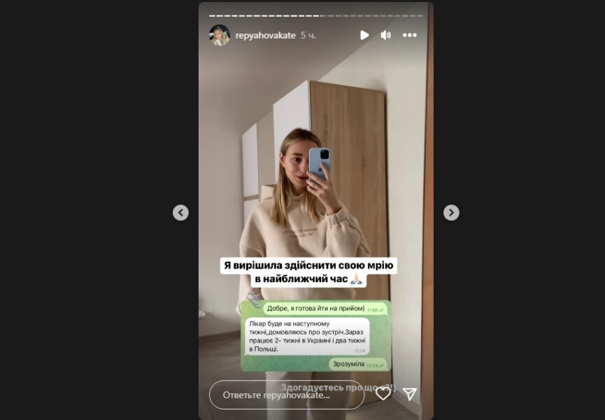 Ще до трагедії в Дніпрі я прокинулася з однією думкою, бажанням здійснити свою мрію і розпочала цим займатись. Потім все було не на часі і я з вами не ділилася цим всім, а зараз відчула, що готова з вами поділитися нарешті. Я дуже сподіваюсь, що скоро моя мрія здійсниться. Чи здогадуєтесь ви про що йде мова?