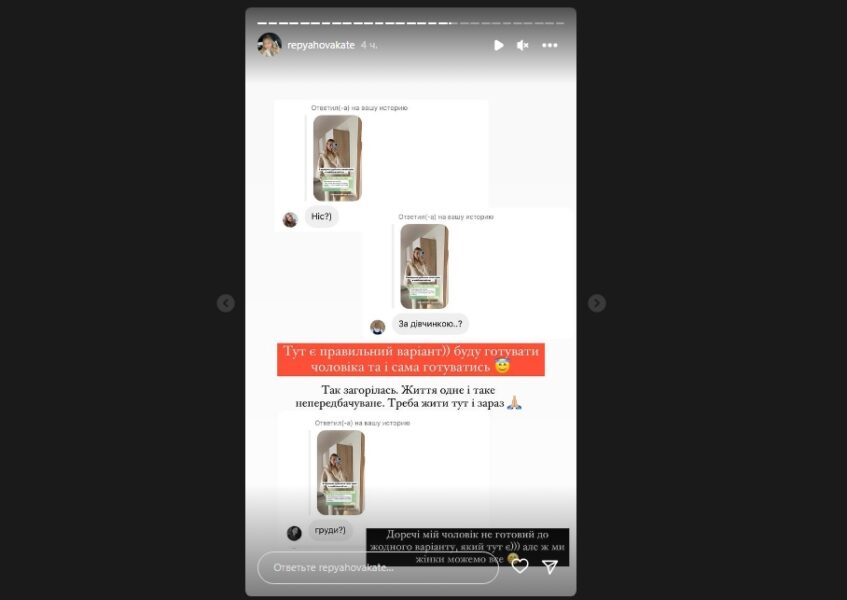Серед версій, які надійшли Катерині в дірект — ніс, груди і друга дитина, дівчинка.