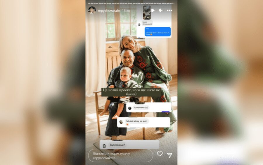 У відповідь на опубліковану Катериною Репяховою новину про те, що вони з Віктором Павліком можуть стати героями української телепрограми, шанувальники та підписники блогерки почали припускати, в якому проєкті вони планують взяти участь. Так, користувачі мережі поділились з дружиною відомого українського музиканта припущеннями, проте, зазначила Репяхова, ні один з підписників не виявився правим.