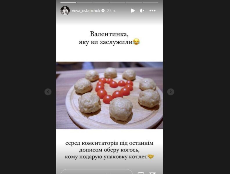 Володимир Остапчук – відомий український шоумен і телеведучий, який славиться бурхливим особистим життям. Поки публіка обговорює новий роман шоумена після другого розлучення, чоловік активно веде свій Інстаграм-блог і не забуває про жарти. Так, 14 лютого, на день всіх закоханих, Володимир Остапчук в жартівливій формі привітав своїх прихильників. Шоумен опублікував у своїх Інстаграм-сторіс фото з сирими котлетами на дощечці. По центру дощечки були викладені помідори-чері у формі сердечка.
