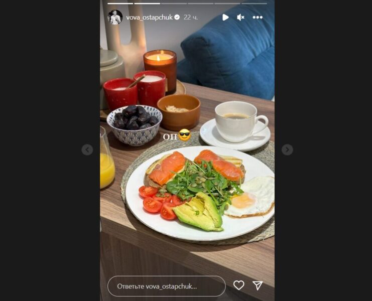 Після цього жарту вже у наступній Інстаграм-сторіс він показав романтичний сніданок, який йому приготувала молода кохана. Так, на тарілці можна розгледіти смажене яйце, 2 тости з червоною рибою, зелень з різним насінням, авокадо і помідори. Також поруч стояла філіжанка кави і апельсиновий сік у склянці. Варто відзначити, що 22-річна кохана Остапчука готує йому смачні і збалансовані сніданки.