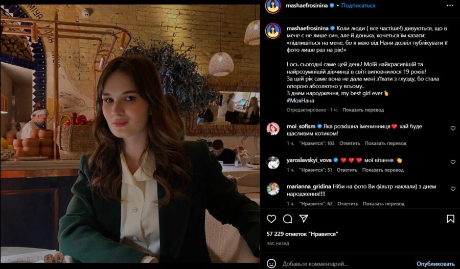 Так, сьогодні, 16 лютого, у своєму Інстаграм-блозі Маша Єфросиніна дуже зворушливо привітала доньку з 19-річчям і показала її свіже фото. На світлині Нана позувала у ресторані. Дівчина була одягнена у білу сорочку та чорний жакет. Її волосся було завите у легкі локони, а на обличчі був денний макіяж. Варто відзначити, що Нана неймовірно схожа на свою зіркову маму.