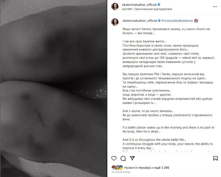 Катерина відмітила, що кожного дня вона намагається вдосконалити своє тіло, зробити ідеальними вигини, “зламати” свої стопи, вивернути суглоби у неприродний стан та розтягнути м’язи до майже нереальних 180 градусів.