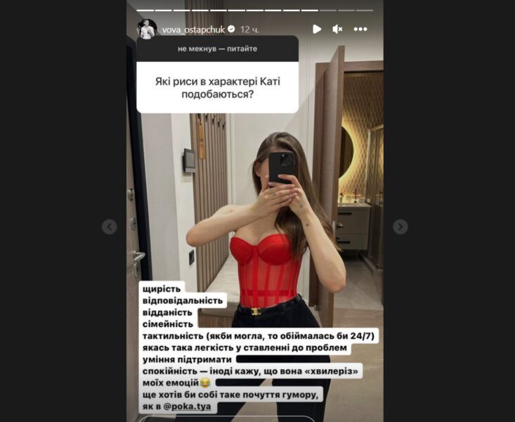Нещодавно Остапчук відповідав на питання своїх підписників в Інстаграм і розповів, що саме йому подобається у Полтавській. Так, телеведучий зауважив, що йому подобається щирість, відповідальність, відданість, сімейність, тактильність, легкість у ставленні до проблем, вміння підтримати, спокійність та почуття гумору.
