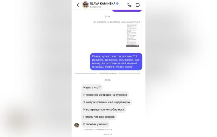 Втім, Слава Камінська вирішила не мовчати й відповісти на всі запитання. Зокрема, артистка відповіла на особисте повідомлення користувача Інстаграм. Так, підписники Камінської поцікавився, навіщо вона починає мовний скандал, а співачка зазначила – вона говорила й продовжуватиме говорити російською мовою.