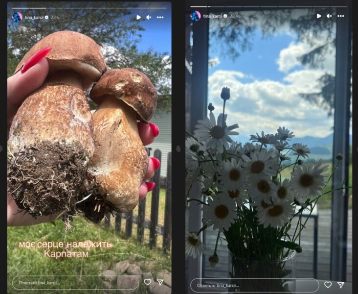 , – написала Тіна Кароль під фото з власноруч зібраними білими грибами. Ще вона показала неймовірний гірський пейзаж з вікна таромашки у вазі.