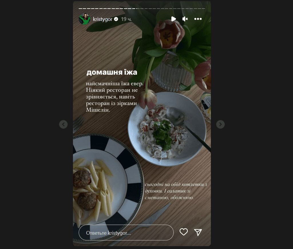 А от під час заміжжя картина виглядала зовсім по-іншому. Горняк підводилася раненько, щоб зготувати коханому чоловіку сніданок. І неабиякий! Схоже, Христина була вдоволена результатами власної кулінарної праці: