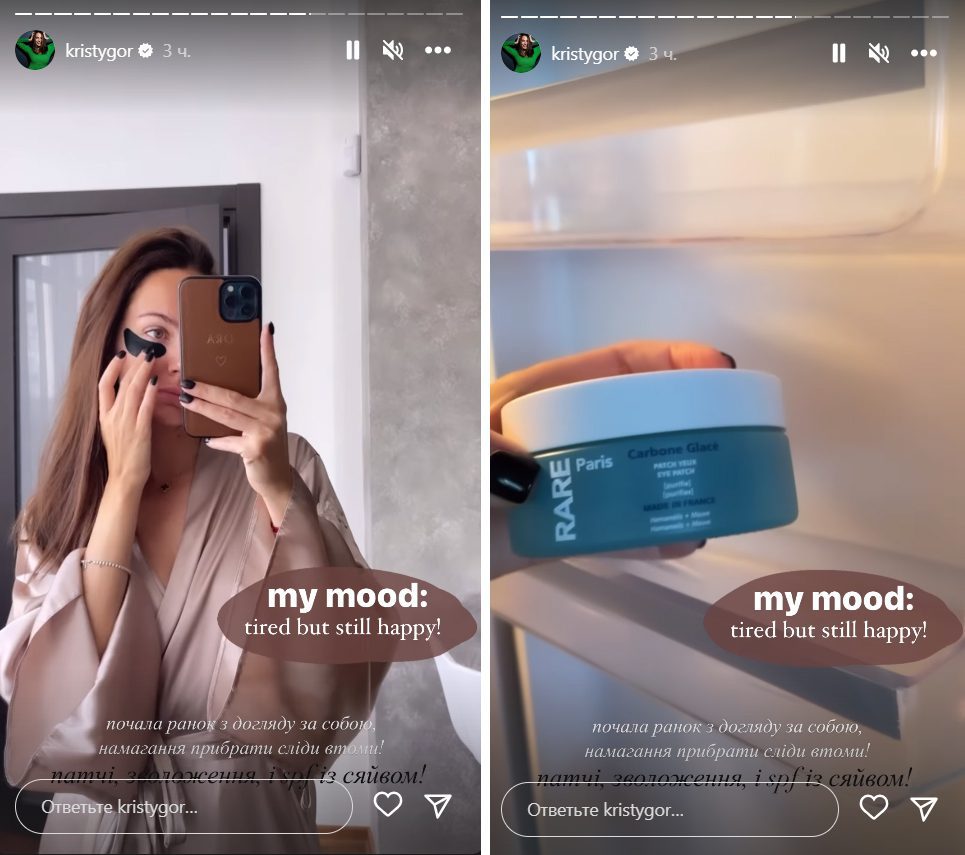 Христя зазнала тяжкої хвороби нирок і практично перестала готувати, чого не траплялося за подружнього життя. У Сторіз в Інсті Горняк показала, як відкриває холодильник і дістає звідти баночку крему, який щедро мастить на обличчя.