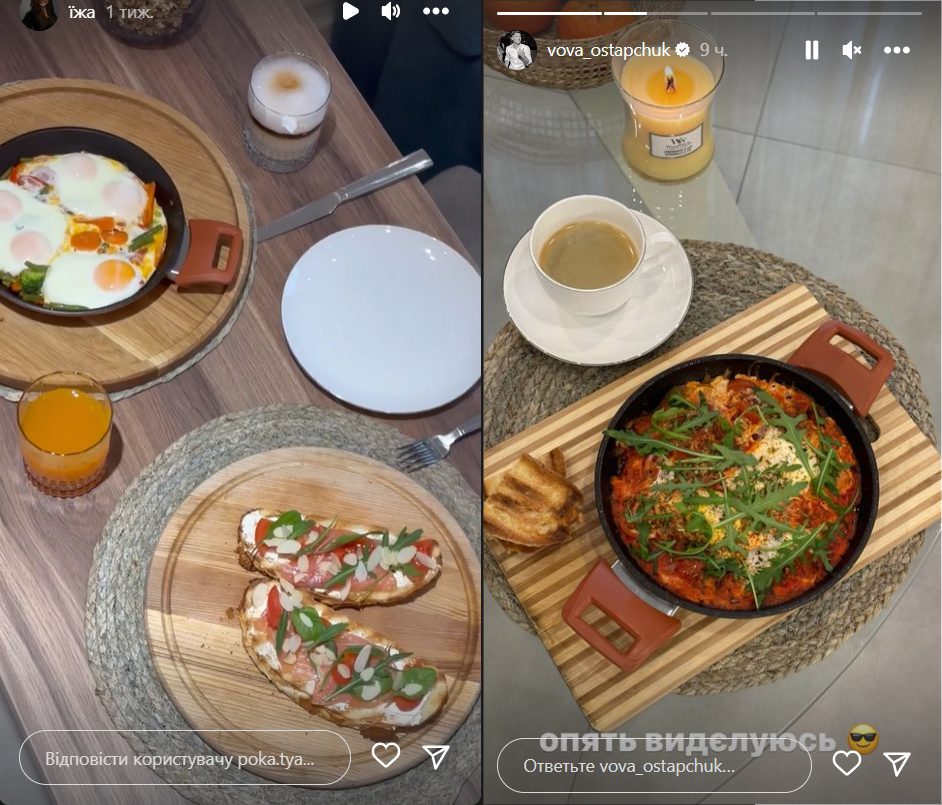 На правій світлині Полтавська видала ще один шедевр – шакшуку – зроблений на основі яєчні з овочами й прикрашений руколою. Для комплекту хазяєчка додала тости й каву. Ще й свічку запалила для підсилення романтичної обстановки.