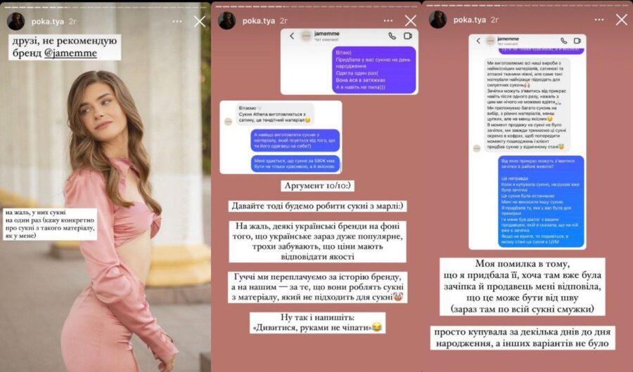 Катерина показала свою сукню з дня народження і листування з брендом з приводу своєї претензії. Кохана Остапчука написала менеджеру, що цю сукню одягла один раз і вона вже вся в затяжках. Дівчині відповіли, що це плаття виготовлене з тендітного матеріалу, однак для Каті це не аргумент, враховуючи ціну – 590 євро.