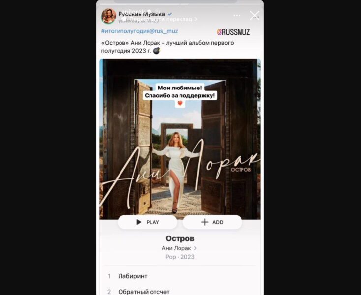 Нещодавно в своєму Інстаграм-блозі Ані Лорак похизувалася черговим “досягненням”, яким тільки підтвердила свій статус зрадниці – її альбом “Остров” очолив 1 місце в рейтингу російської музики: