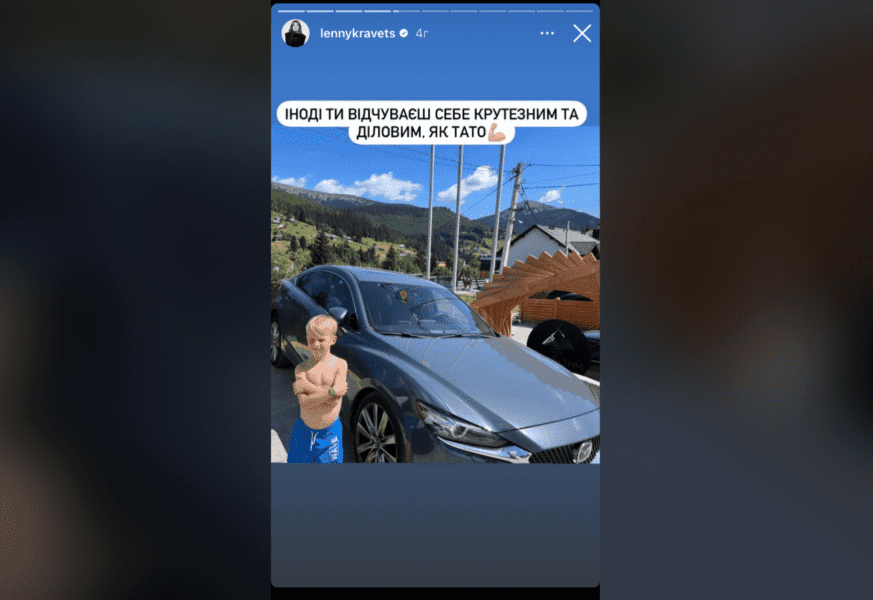 На своїй Інстаграм-сторінці Олена Кравець опублікувала кумедну фотографію свого молодшого сина, який стоїть біля їхньої машини на тлі красивих гір. Хлопчик став у серйозну позу, схрестивши руки на грудях. Підписала фото знаменитість, як і завжди, влучно та з гумором, зазначивши, що іноді її син відчуває себе таким самим крутим і діловим, яким є його батько.