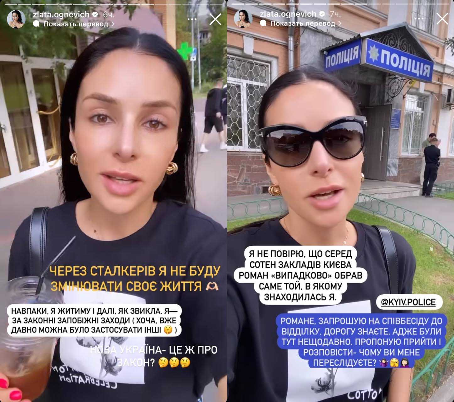 Регулярно потерпає від неадекватів й кримчанка. Один особливо настирливий шанувальник почав відстежувати Злату за мітками в соцмережах і з’являтися саме в тих місцях, де перебувала знаменитість. Звісно, Роман став виправдовуватися, що випадково перетнувся з зіркою. Тож наступного разу Огнєвіч виставила в Сторіз мітку поліцейського відділку на Печерську. І навіть запросила шанувальника туди навідатися, адже йому вже траплялося там бувати.