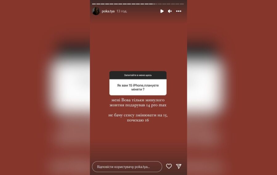 Втім, зіркова блогерка та дружина шоумена не стала приховувати, що насправді вона б хотіла отримати у дарунок від свого обранця наступну модель iPhone. Катерина Полтавська зазначила, що наразі вона не бачить сенсу змінювати телефон, тому просто почекає, поки американська компанія випустить нову модель смартфона.