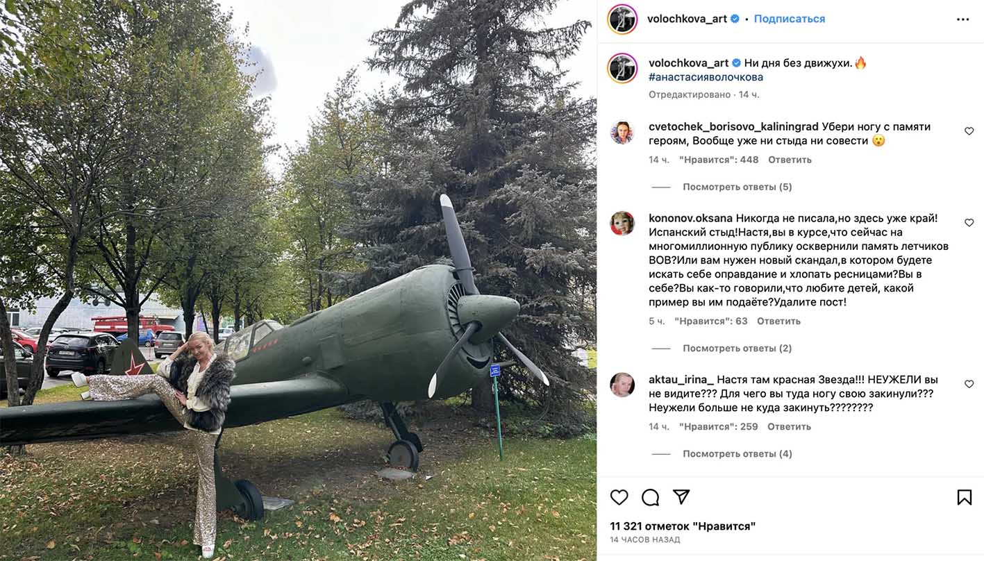 Особливо уважних розлютив ще й підпис, залишений Анастасією під фото: “Ні дня бєз двіжухі” та смайлик у вигляді вогника. Це ж прямісінька “дискредитація армії рф” та “осквернення пам’яті ветеранів” минулої війни вирішили росіяни. На виправдання балерини, що на Мосфільмі її попросили виміряти ногою довжину крила, ніхто не зважив.