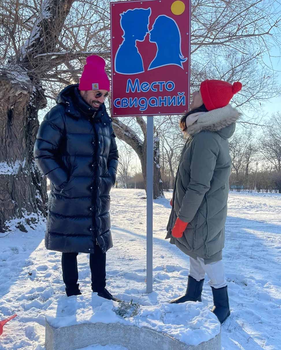 Не обійшлося й без щемкої теми. Андрій виставив доволі романтичну світлину, де пара перебуває разом біля стовпчика з написом “Місце для побачень”. Андрій наголосив, що вони сфотографовані в рідному довоєнному Маріуполі. Бєдняков висловив надію, що вони з Настею ще зустрінуться біля цього стовпчика в недалекому майбутньому.