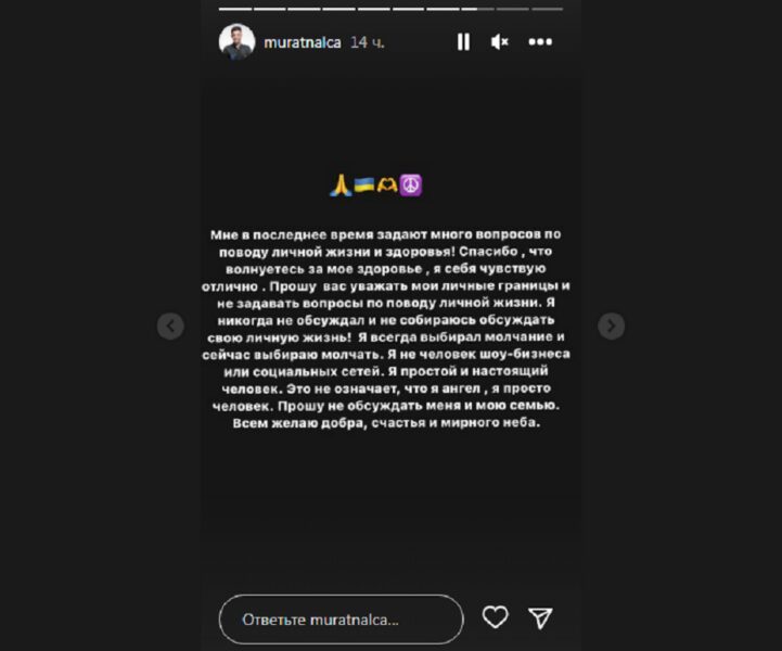Очевидно, що бізнесмена засипали питаннями у приватних повідомленням. Мурат написав лаконічний пост у своєму Інстаграм-блозі, де попросив прихильники не порушувати його особисті кордони і не задавати питань про особисте життя. Налчаджиоглу зазначив, що він не буде говорити на публіку стосунки з дружиною.